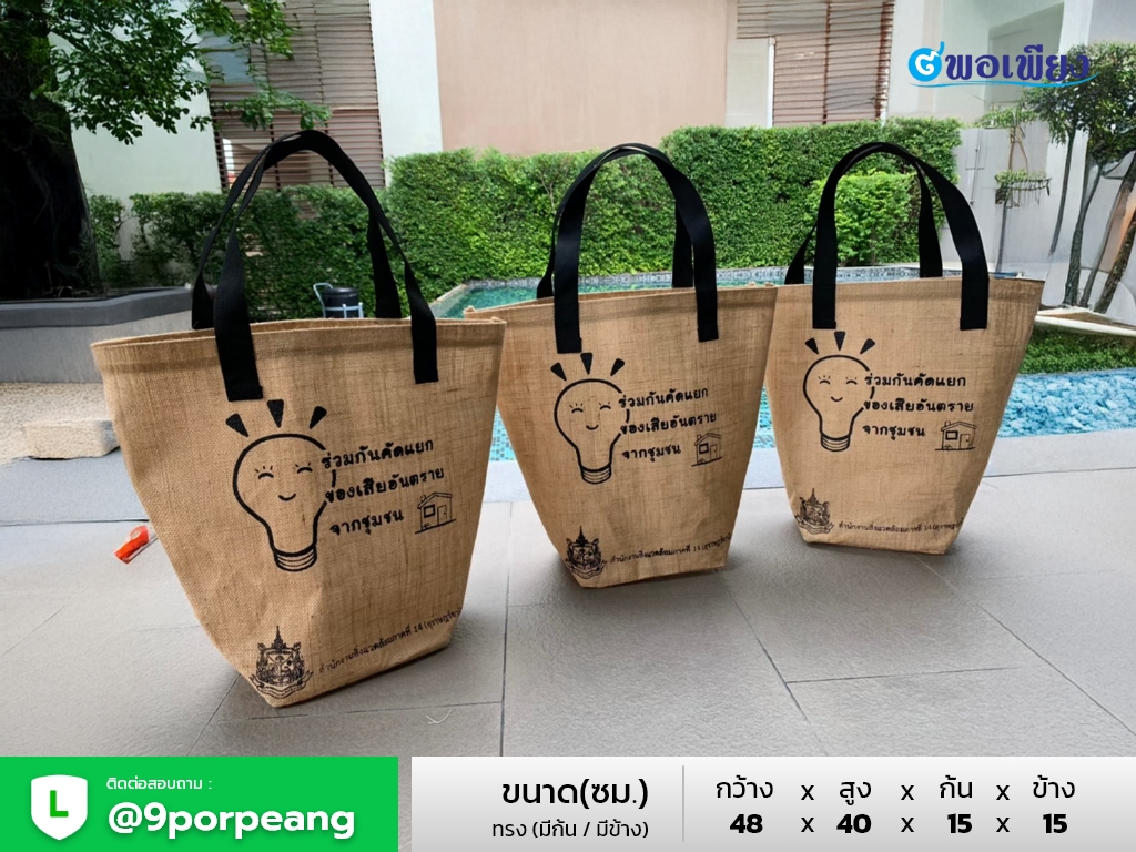กระเป๋าผ้ากระสอบ (Jute Bag / Hessian Bag) ผลิตจากเส้นใยธรรมชาติที่มีความแข็งแรงสูง เนื้อผ้าดูดีมีสไตล์ ให้ความรู้สึกเป็นงานธรรมชาติ เหมาะสำหรับทำเป็น ของพรีเมี่ยม ของที่ระลึก ของแจกองค์กร หรือใช้งานทั่วไป ด้วยความทนทานและภาพลักษณ์ที่เป็นมิตรต่อสิ่งแวดล้อม จึงได้รับความนิยมในธุรกิจที่ให้ความสำคัญต่อ Sustainability